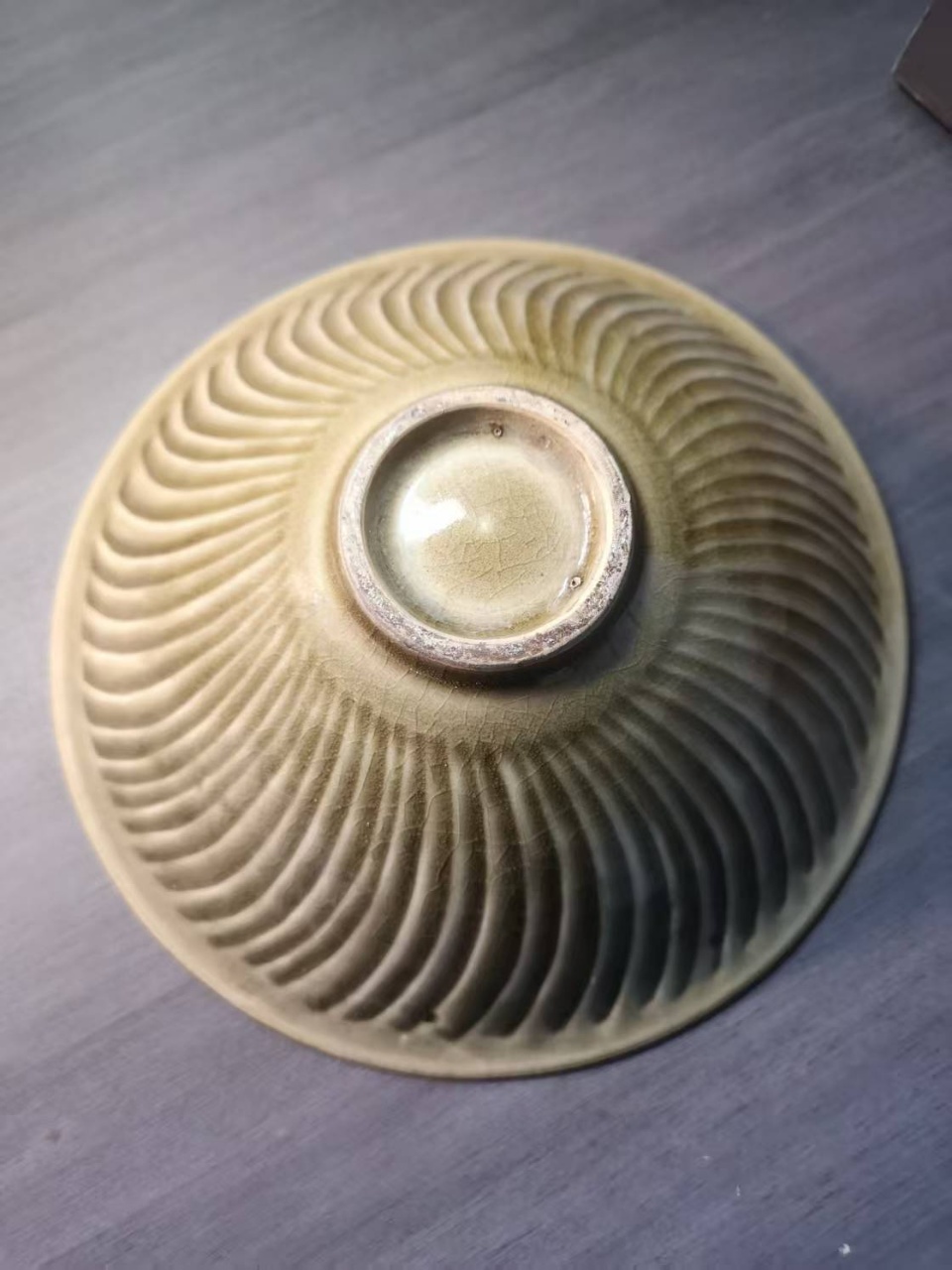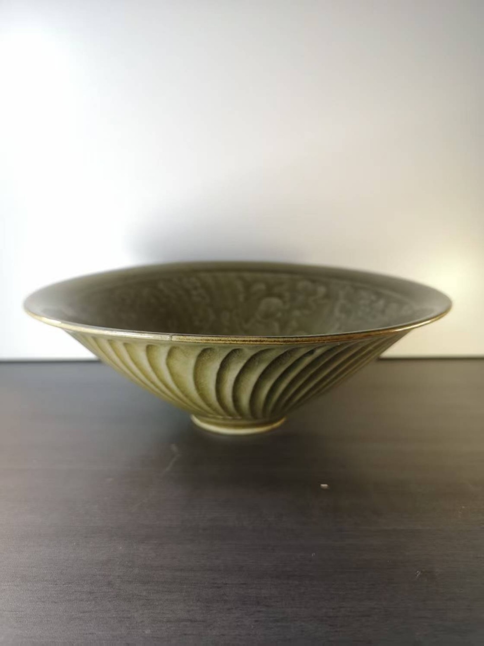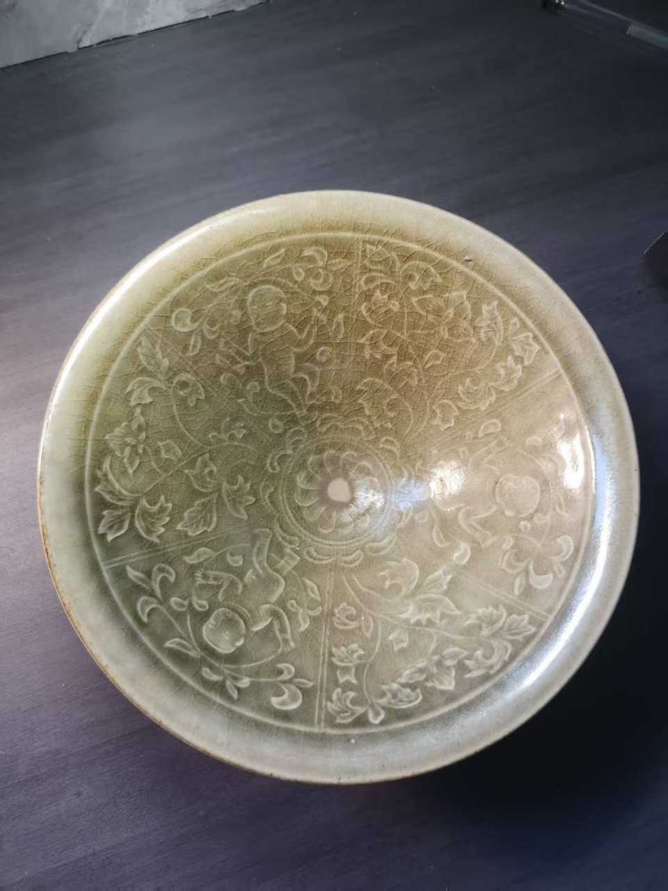 北宋耀州窑婴戏缠枝花惠纹青釉刻花斗笠碗