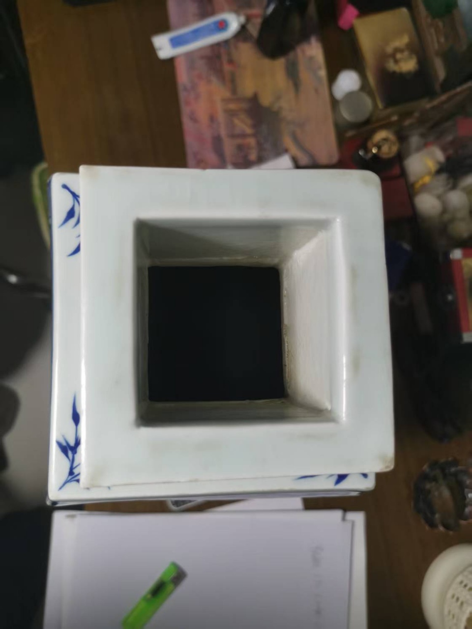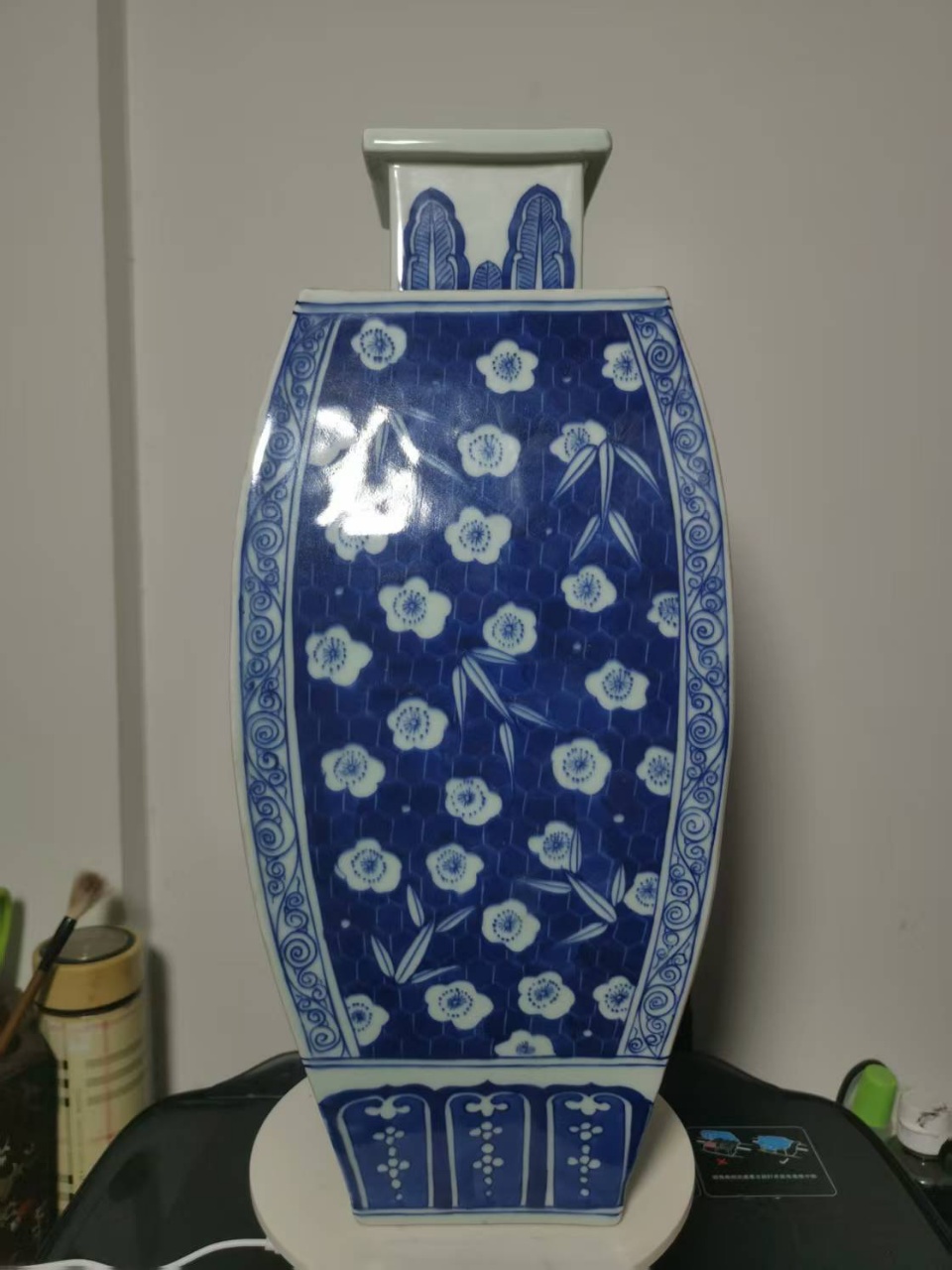 大清康熙年制青花花鸟、冰梅纹四方鼓腹方口瓶
