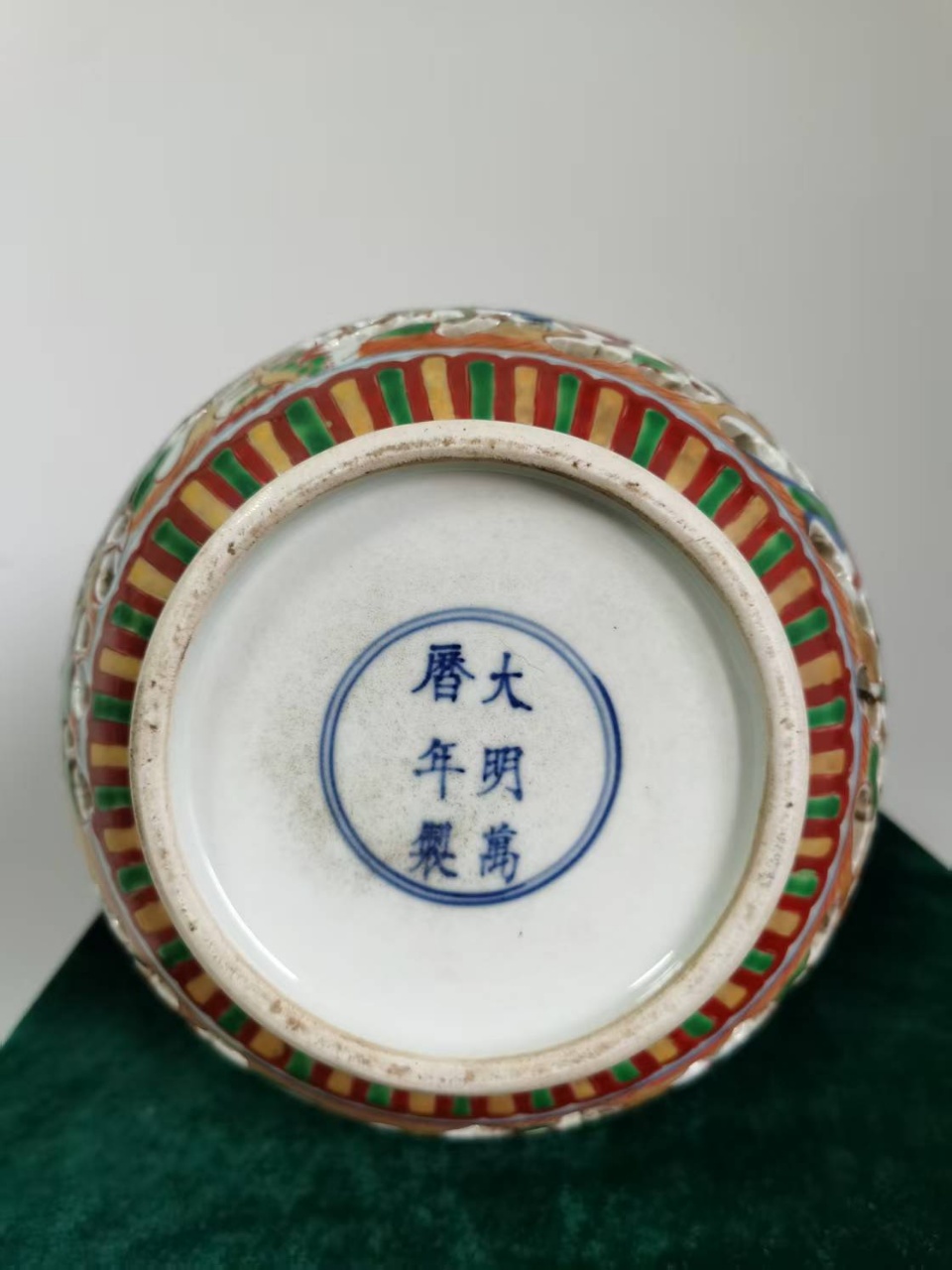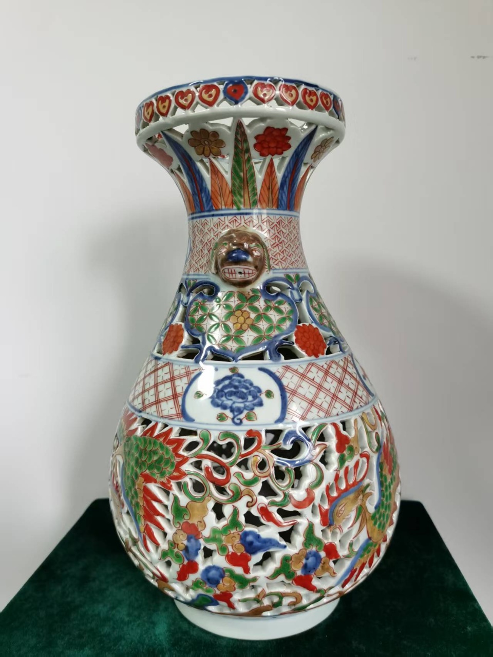 大明万历青花五彩镂空凤穿花双兽首盘口尊