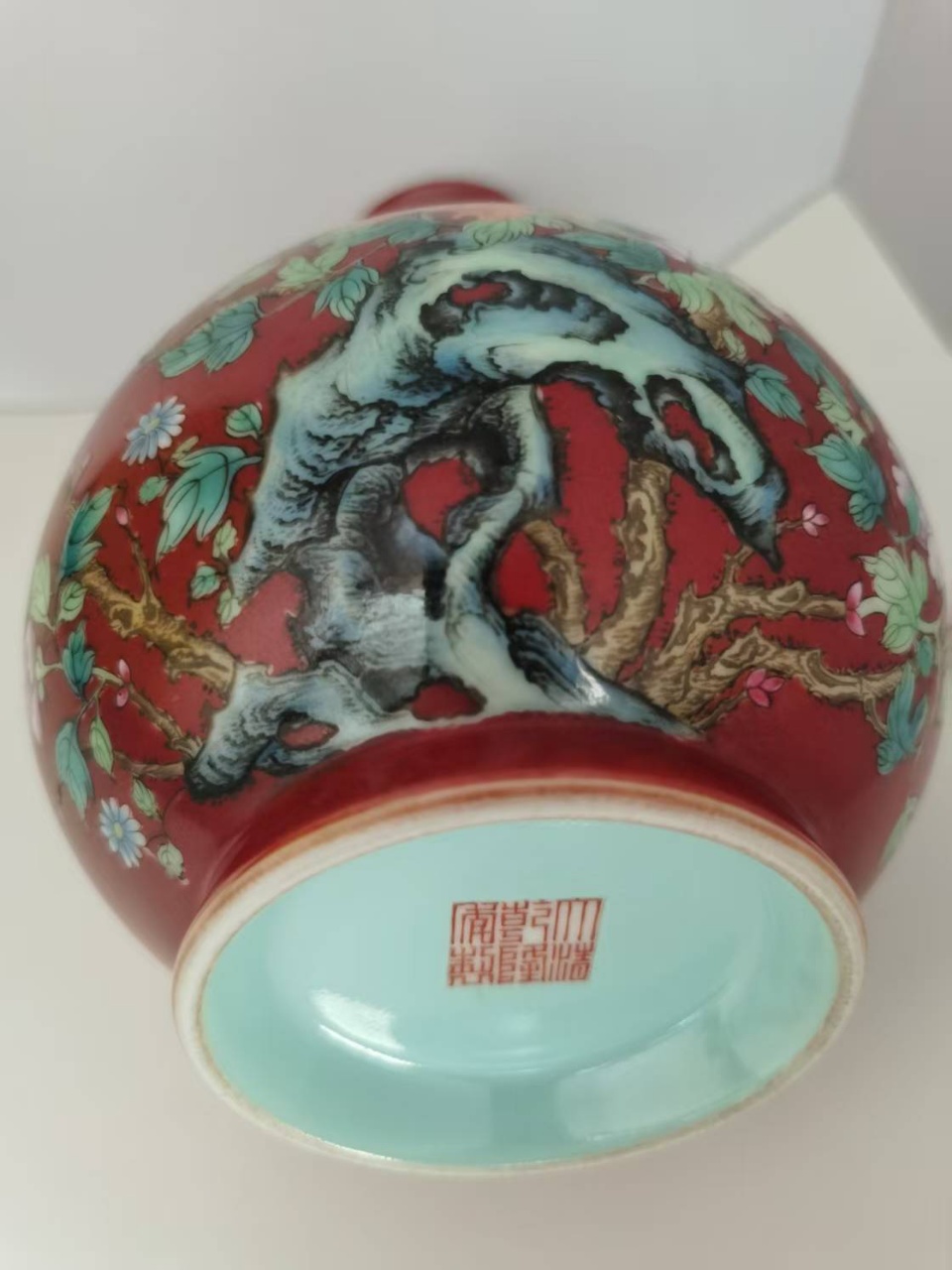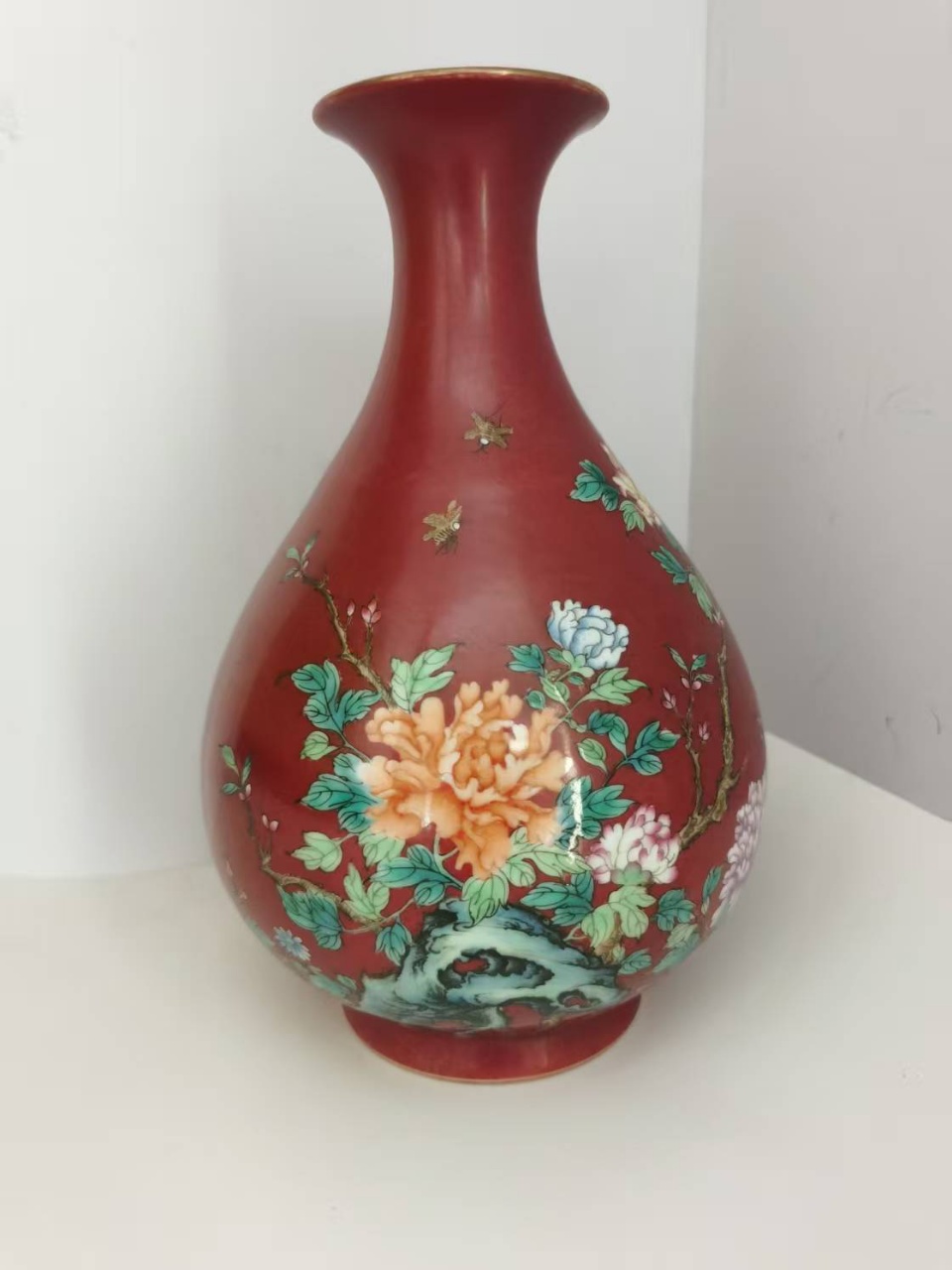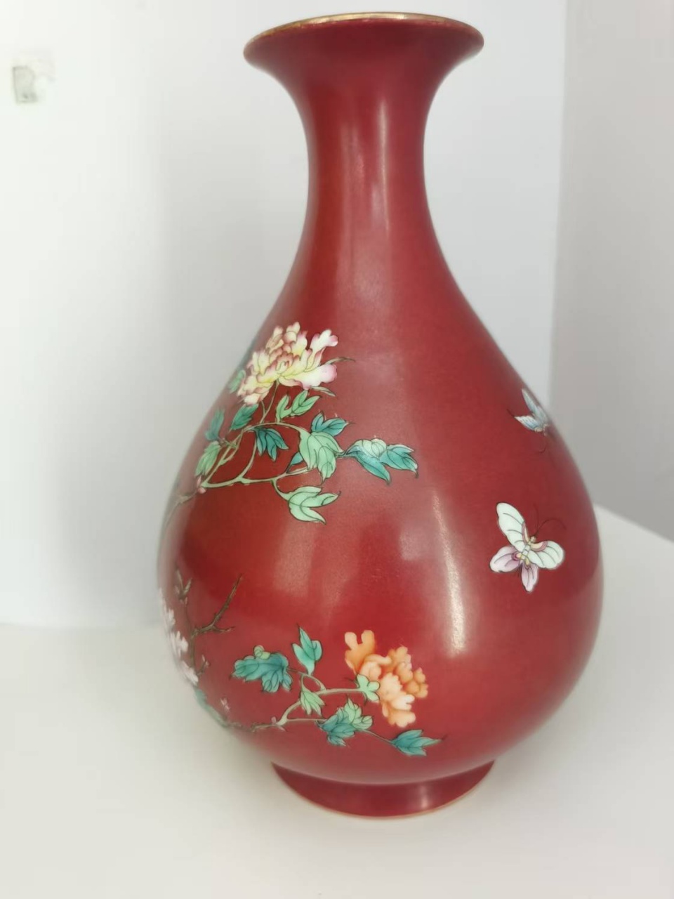胭脂红地粉彩花卉蝴蝶纹玉壶春瓶