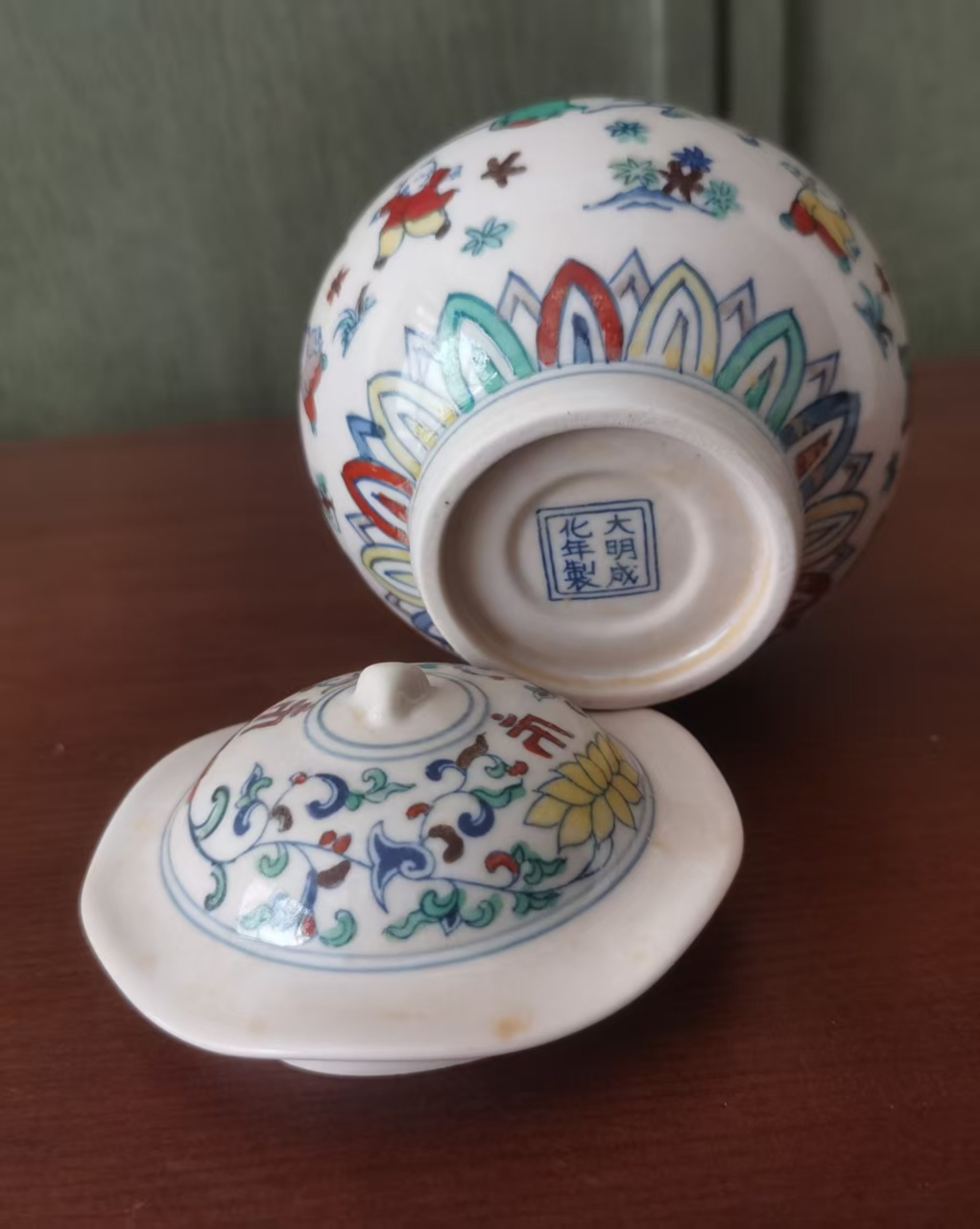 大明成化年制斗彩花草叶盖罐(一对)