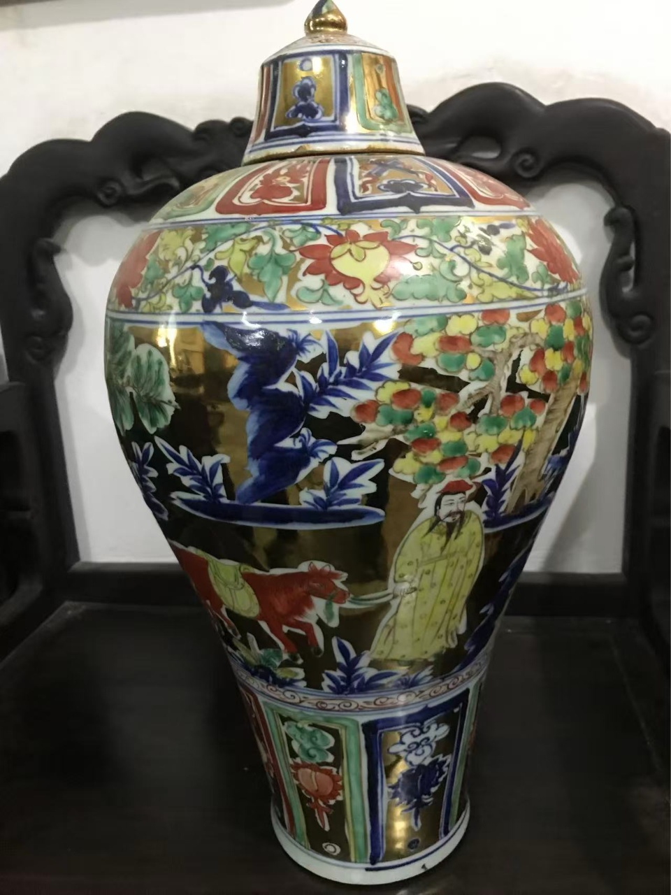 金地斗彩“萧何月下追韩信”人物纹梅瓶