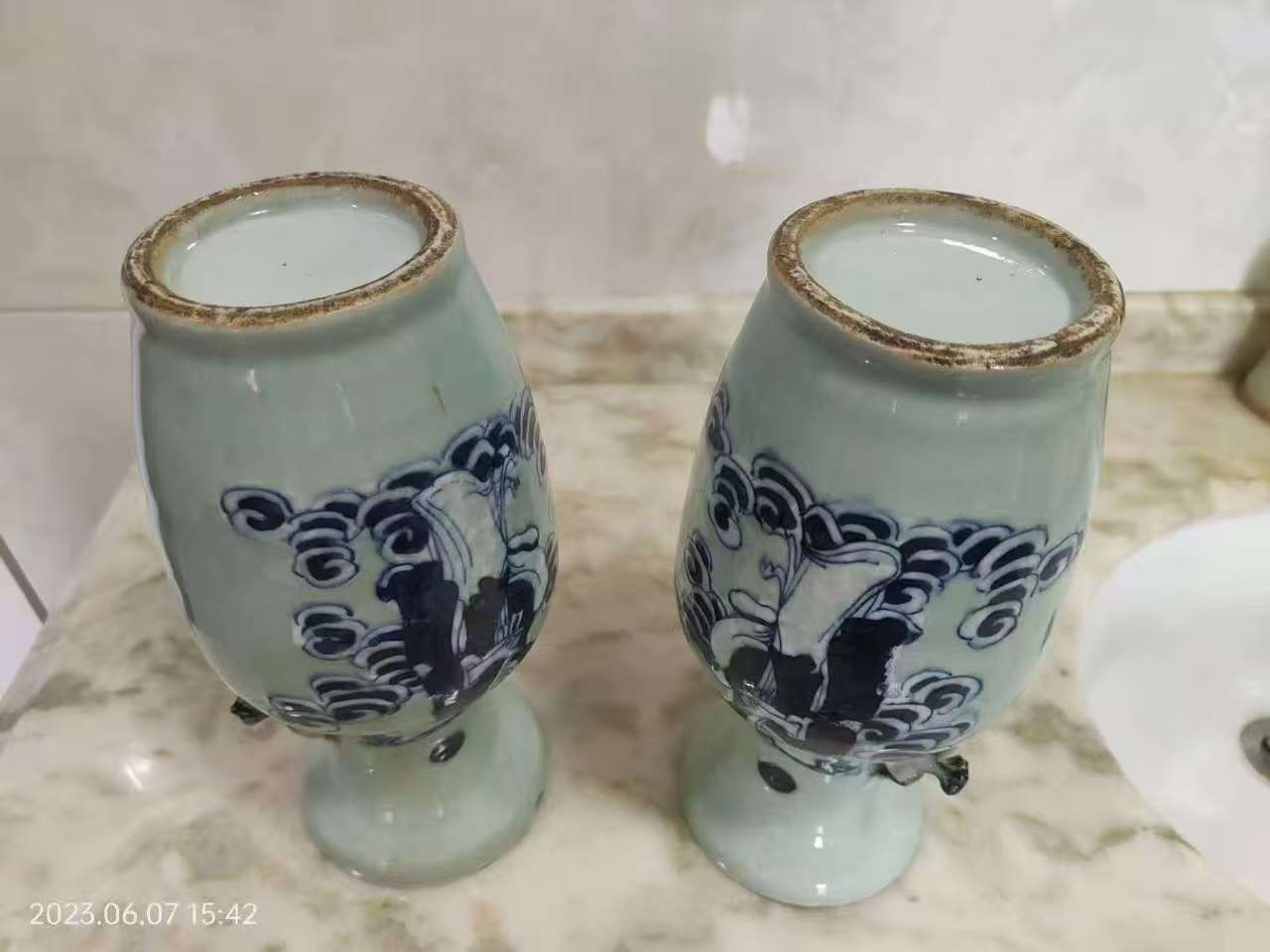 清代清花瓷瓶一对,豆青釉,青花人物双耳瓷对