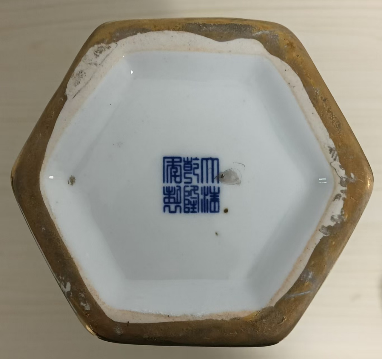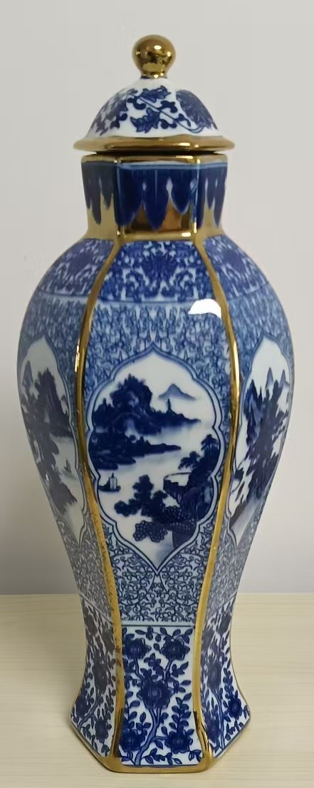 大清乾隆六棱青花山水纹描金将军罐