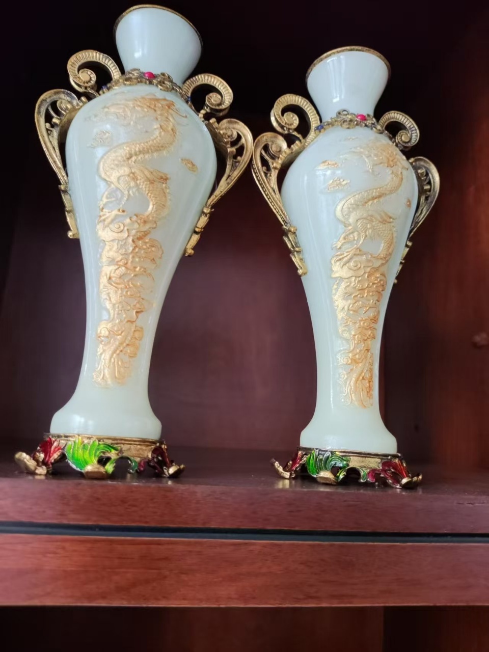 乾隆年制和田羊脂玉,金镶玉龙凤瓶一对