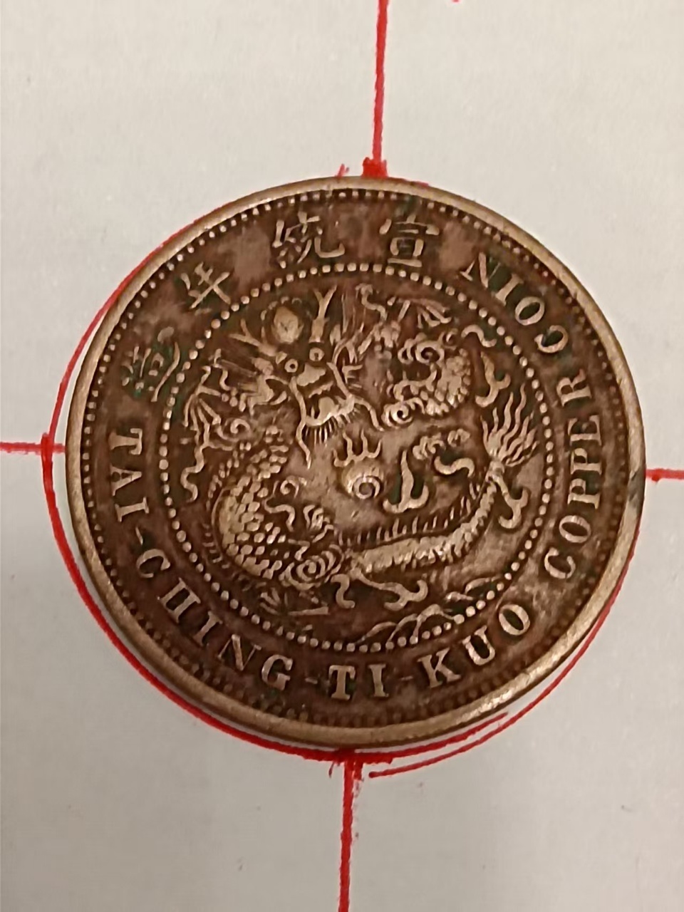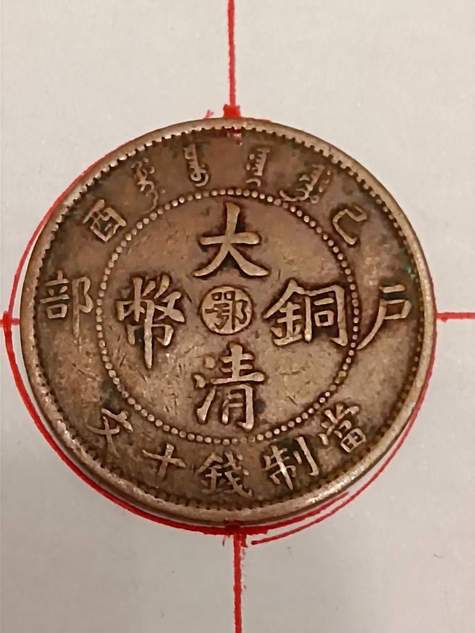 大清铜币中心鄂,当制钱十文,钱币背逆30一40度