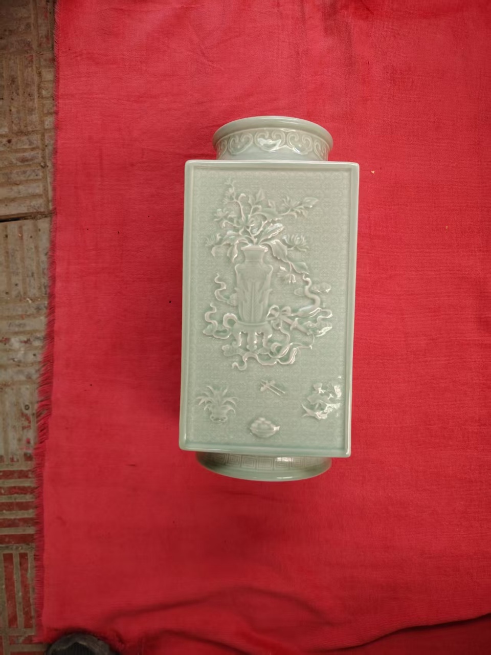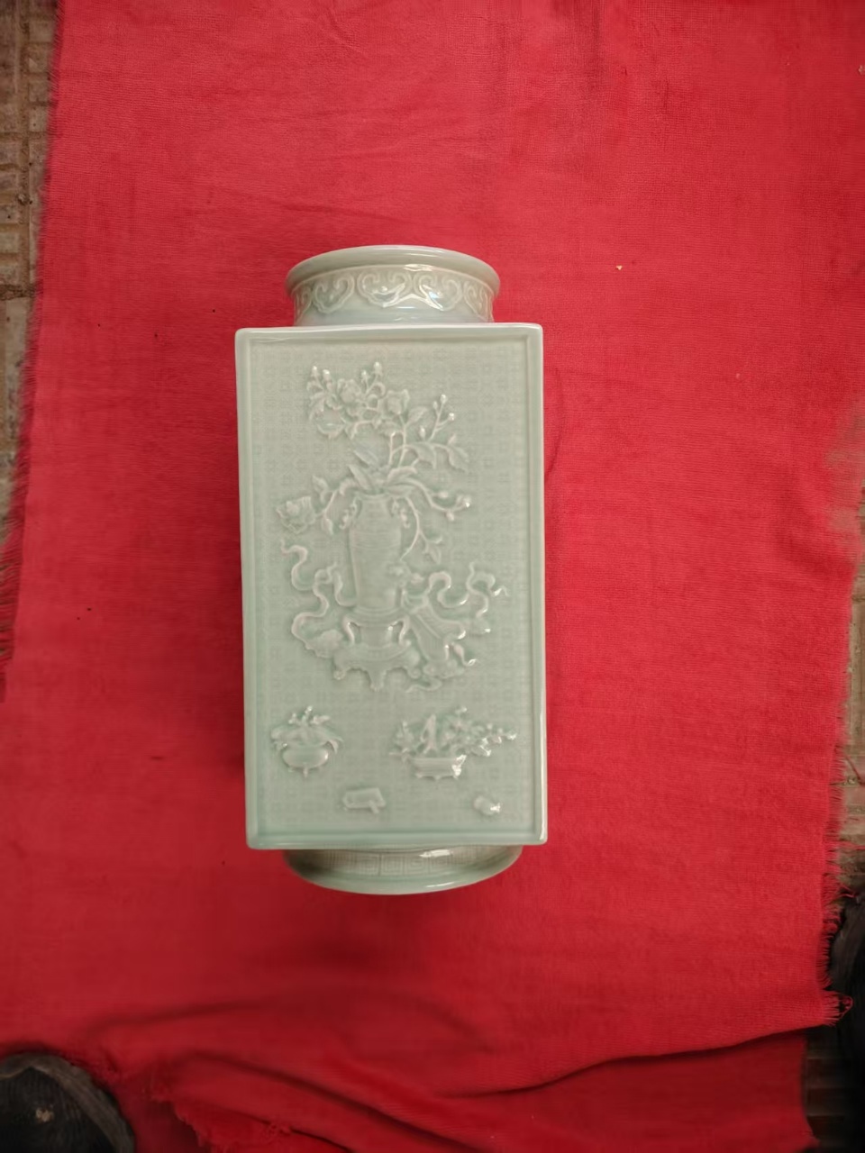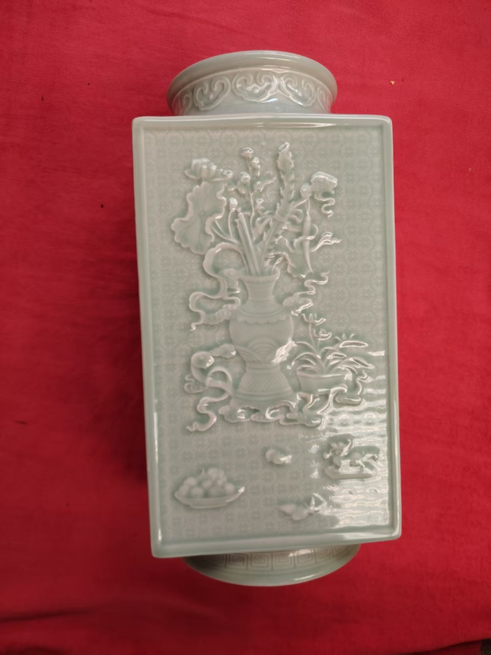 大清乾隆年制,粉青釉精刻博古纹琮式瓶