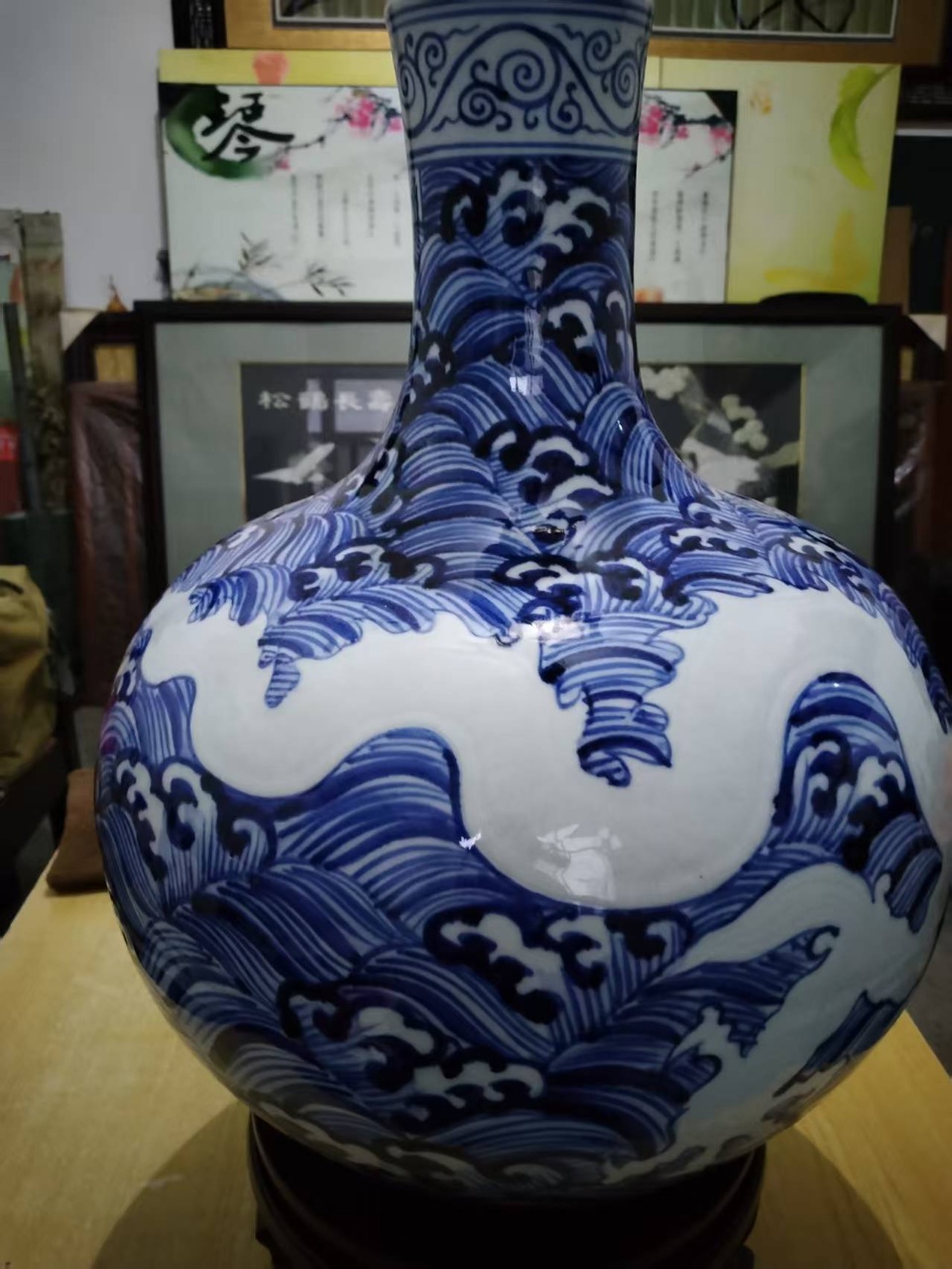 大明永乐年制,青花海水留白五爪龙厚胎天球瓶