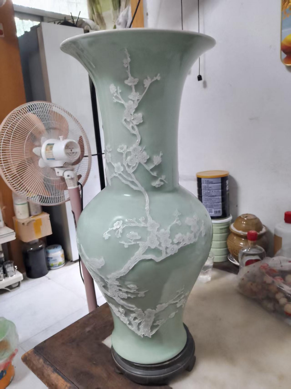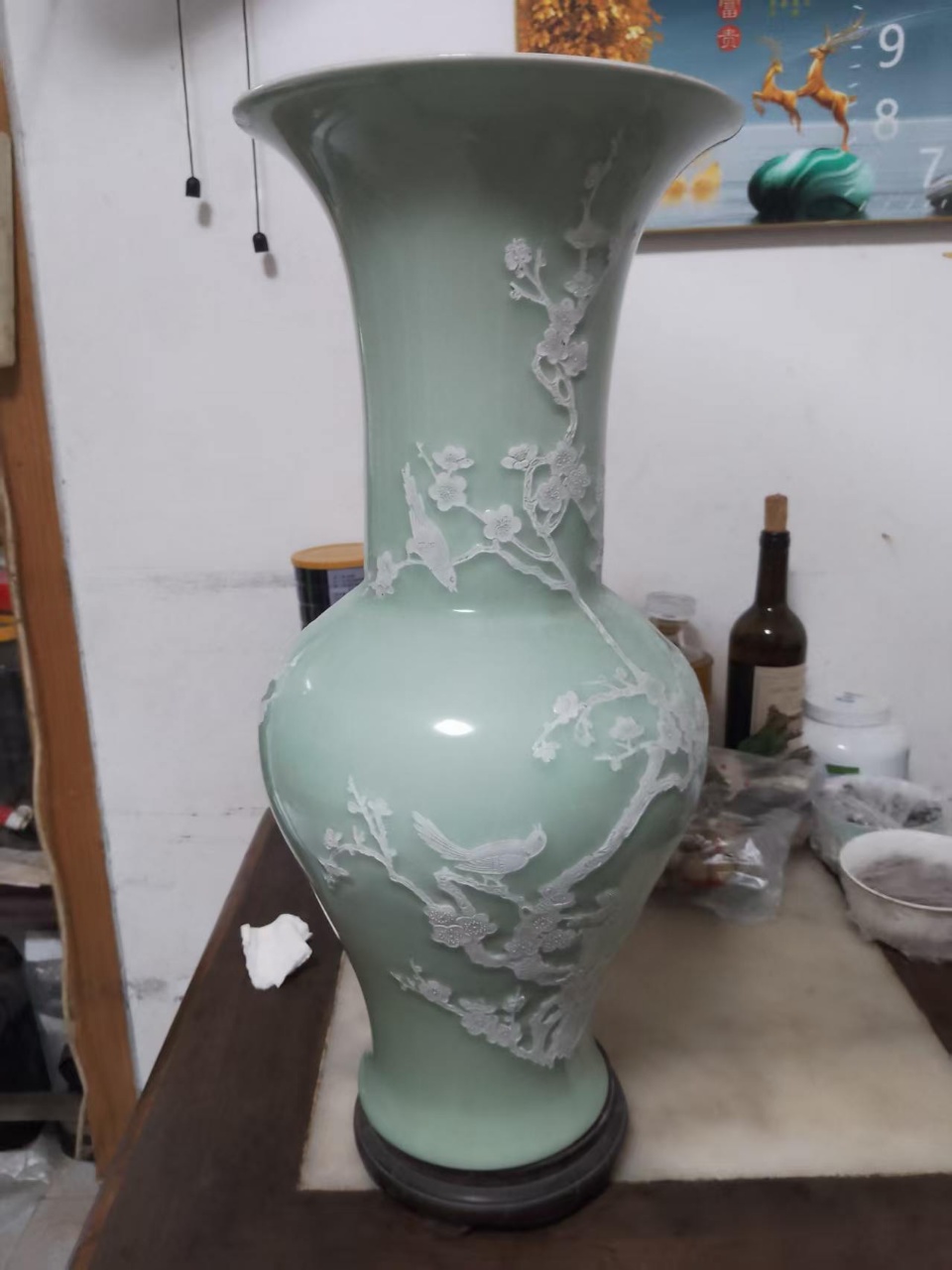 大清康熙年製青釉白梅花鸟纹花觚