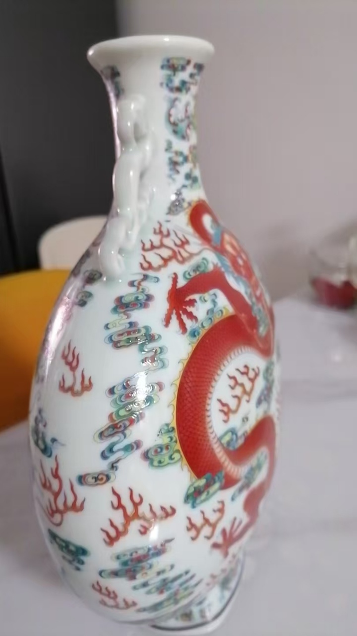 五彩苍龙教子纹双耳抱月瓶