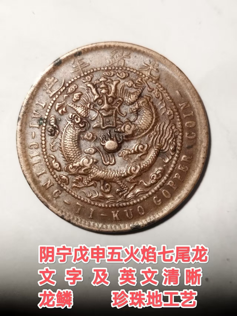大清铜币戊申阴宁五火焰七尾龙版