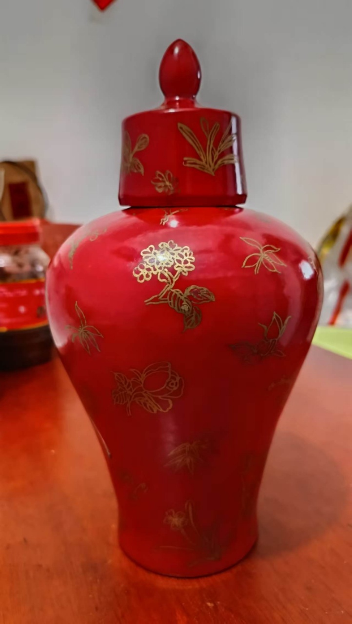 乾隆款郎窑红双马描金缠技纹带盖梅瓶