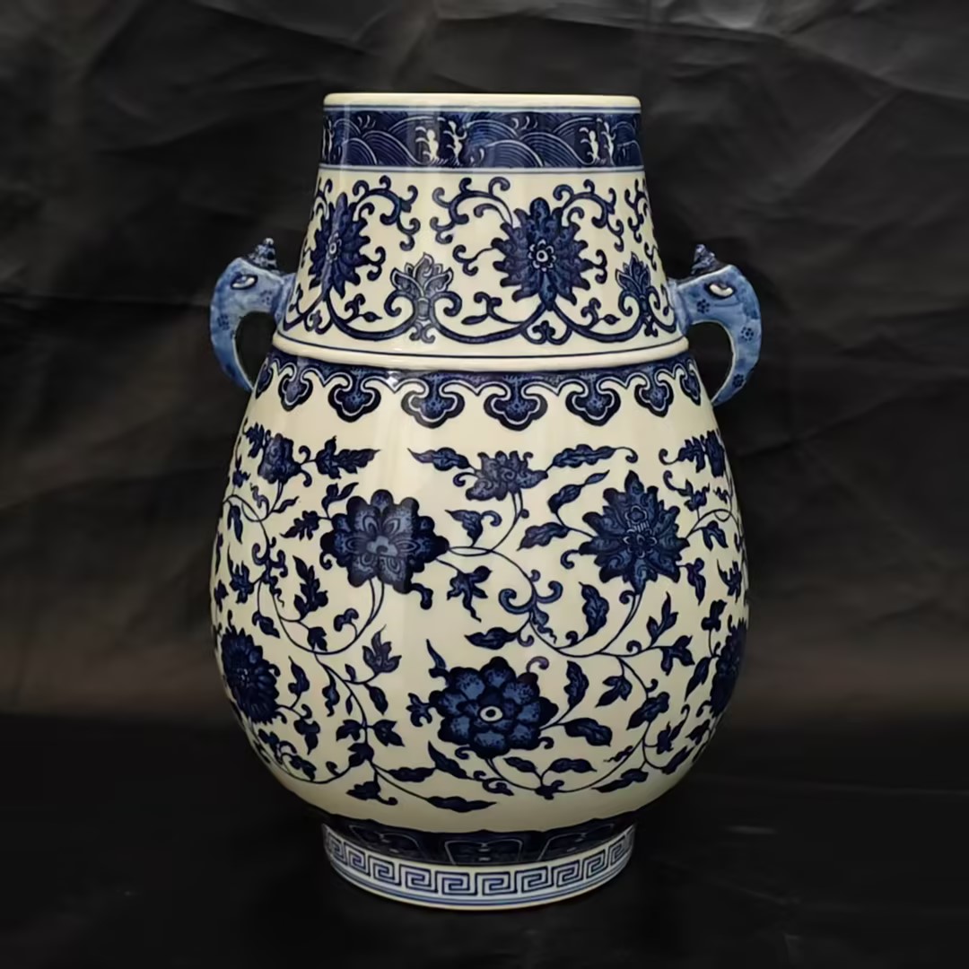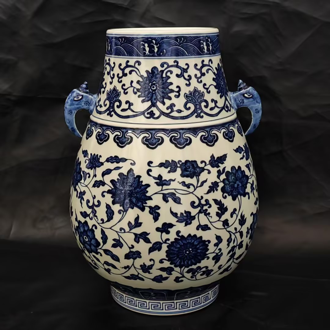 清乾隆青花牡丹连枝纹象耳樽