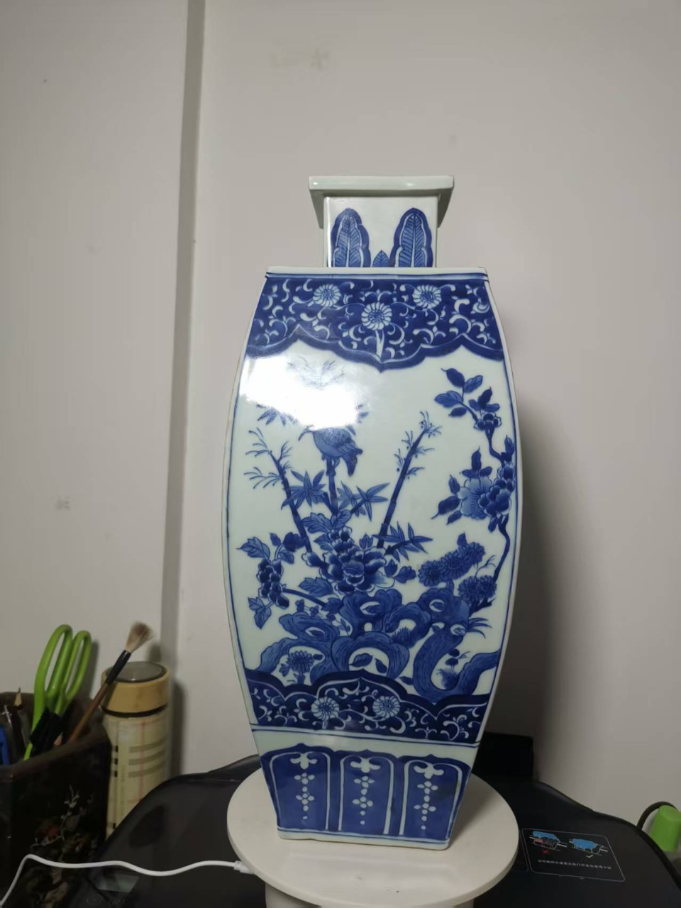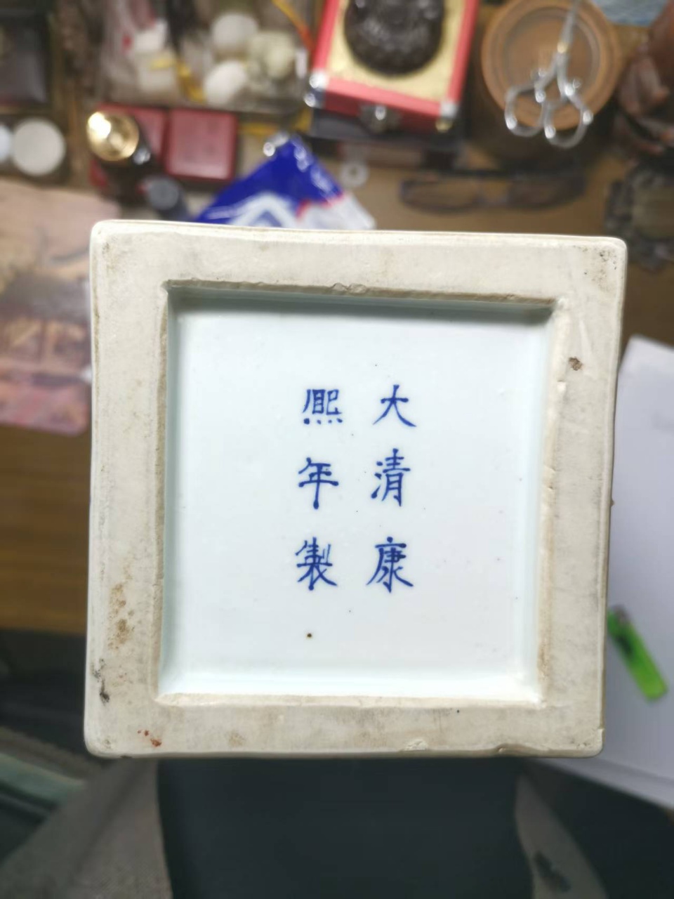 大清康熙年制青花花鸟、冰梅纹四方鼓腹方口瓶