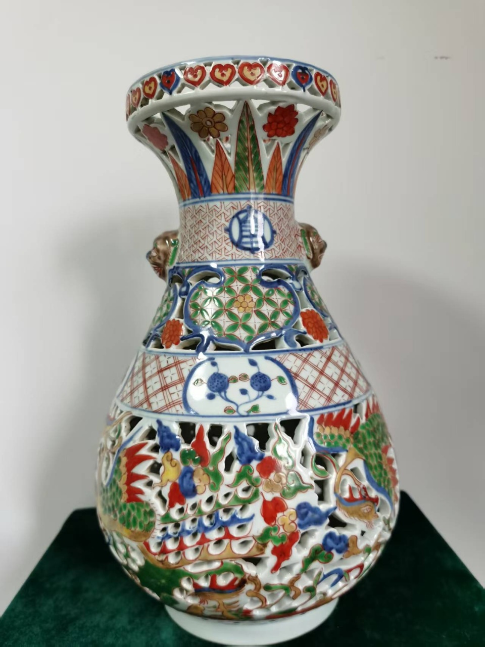 大明万历青花五彩镂空凤穿花双兽首盘口尊