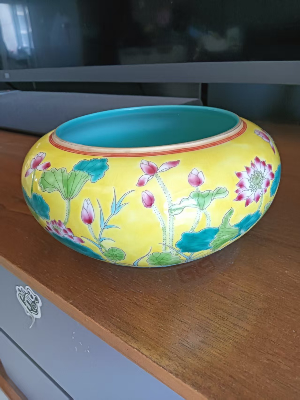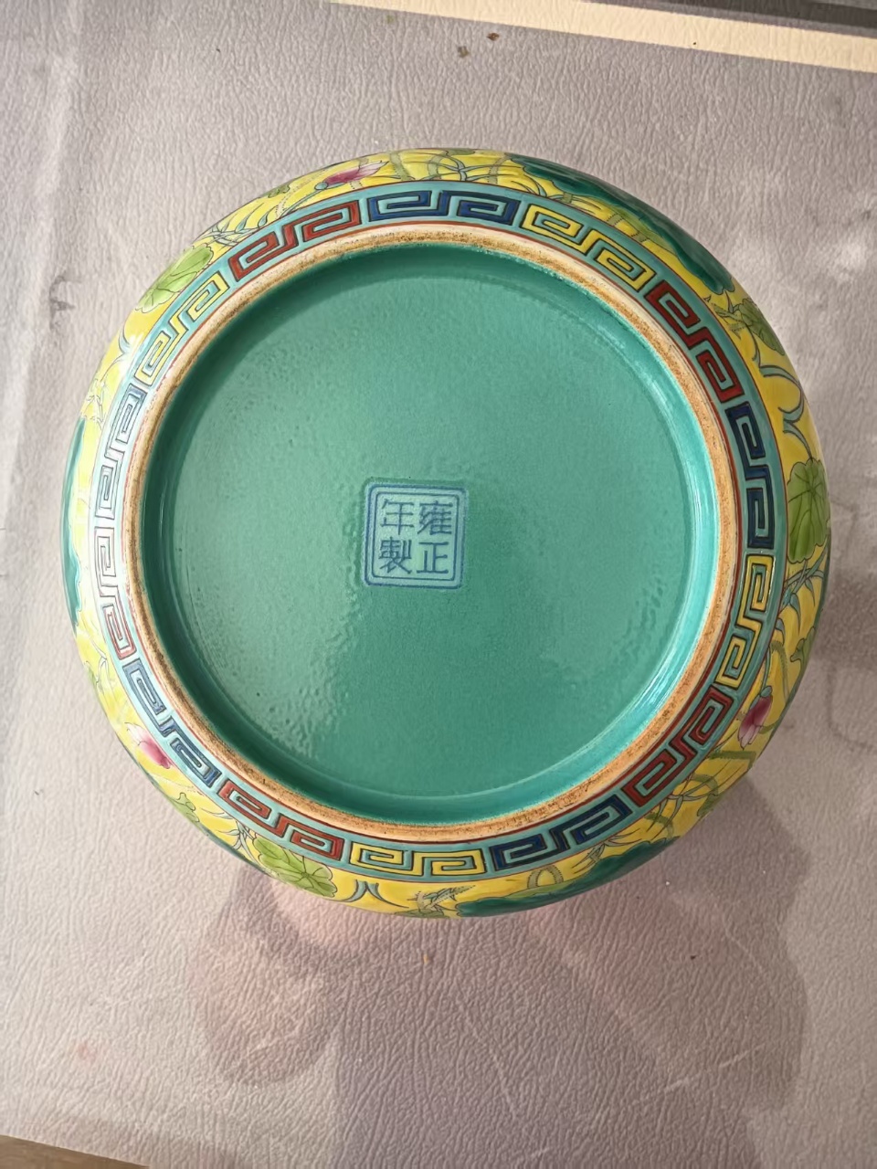 雍正黄地粉彩荷花纹笔洗
