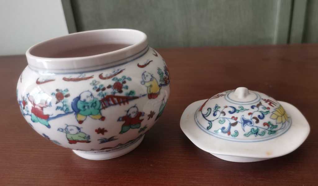 大明成化年制斗彩花草叶盖罐(一对)