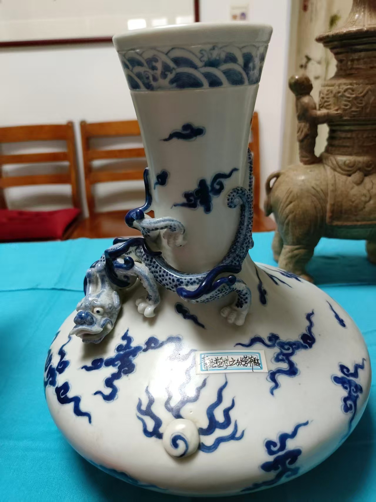 青花塑龙云水纹荸荠赏瓶