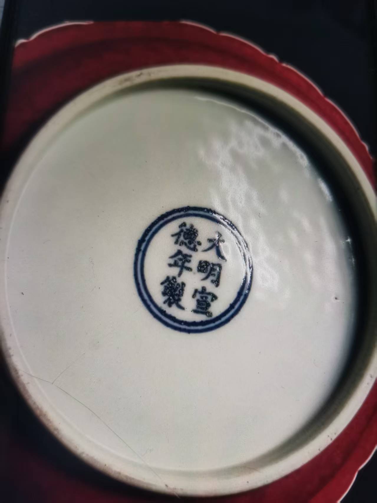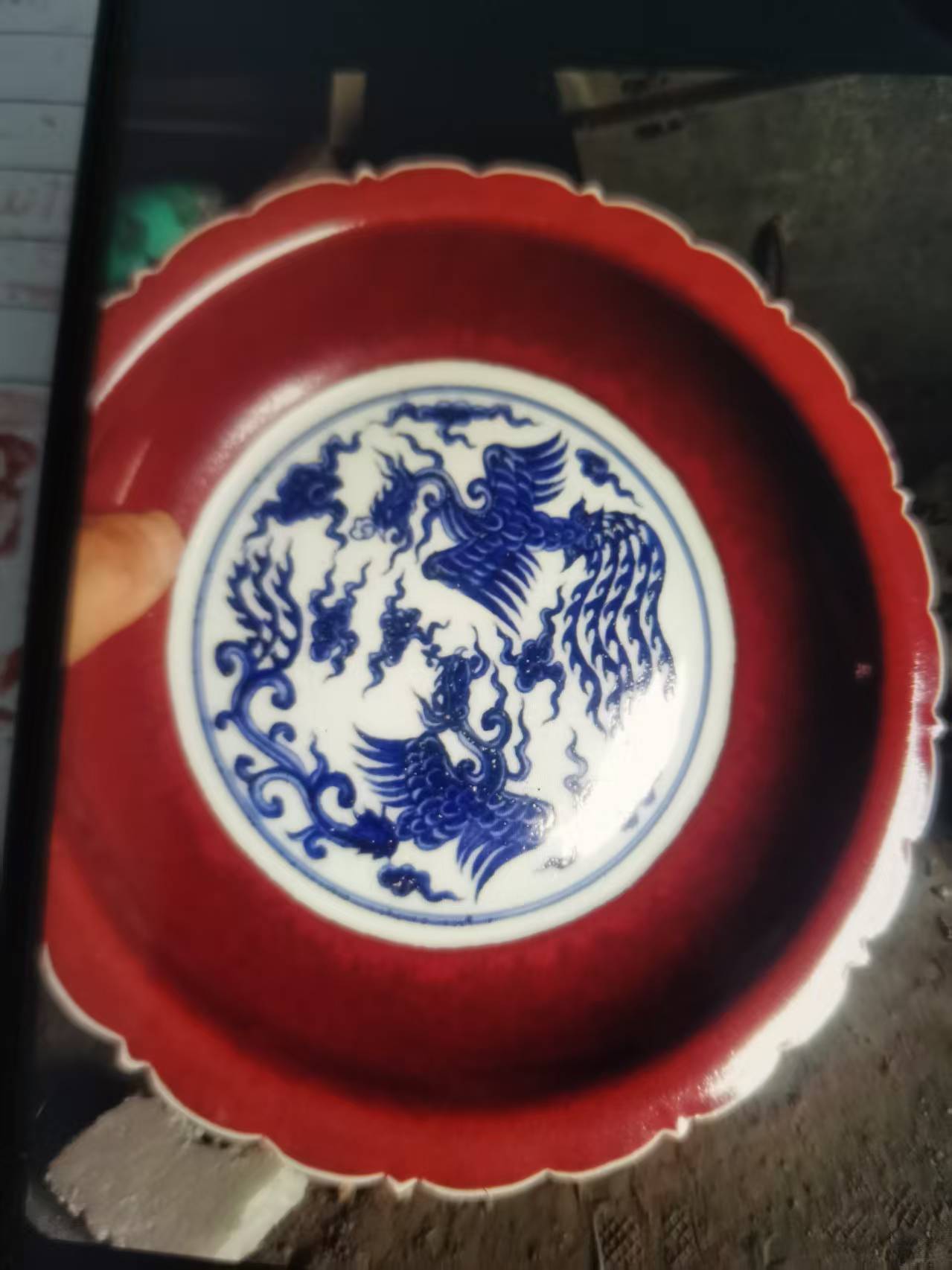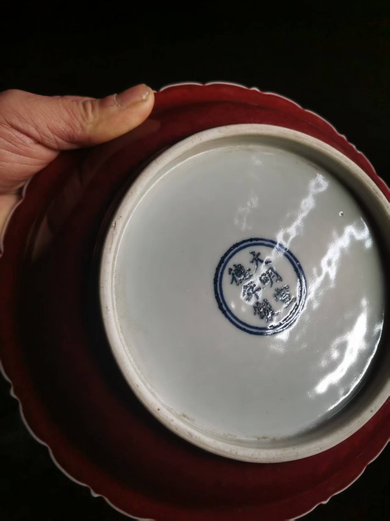 大明宣德霁红釉双凤花口盘