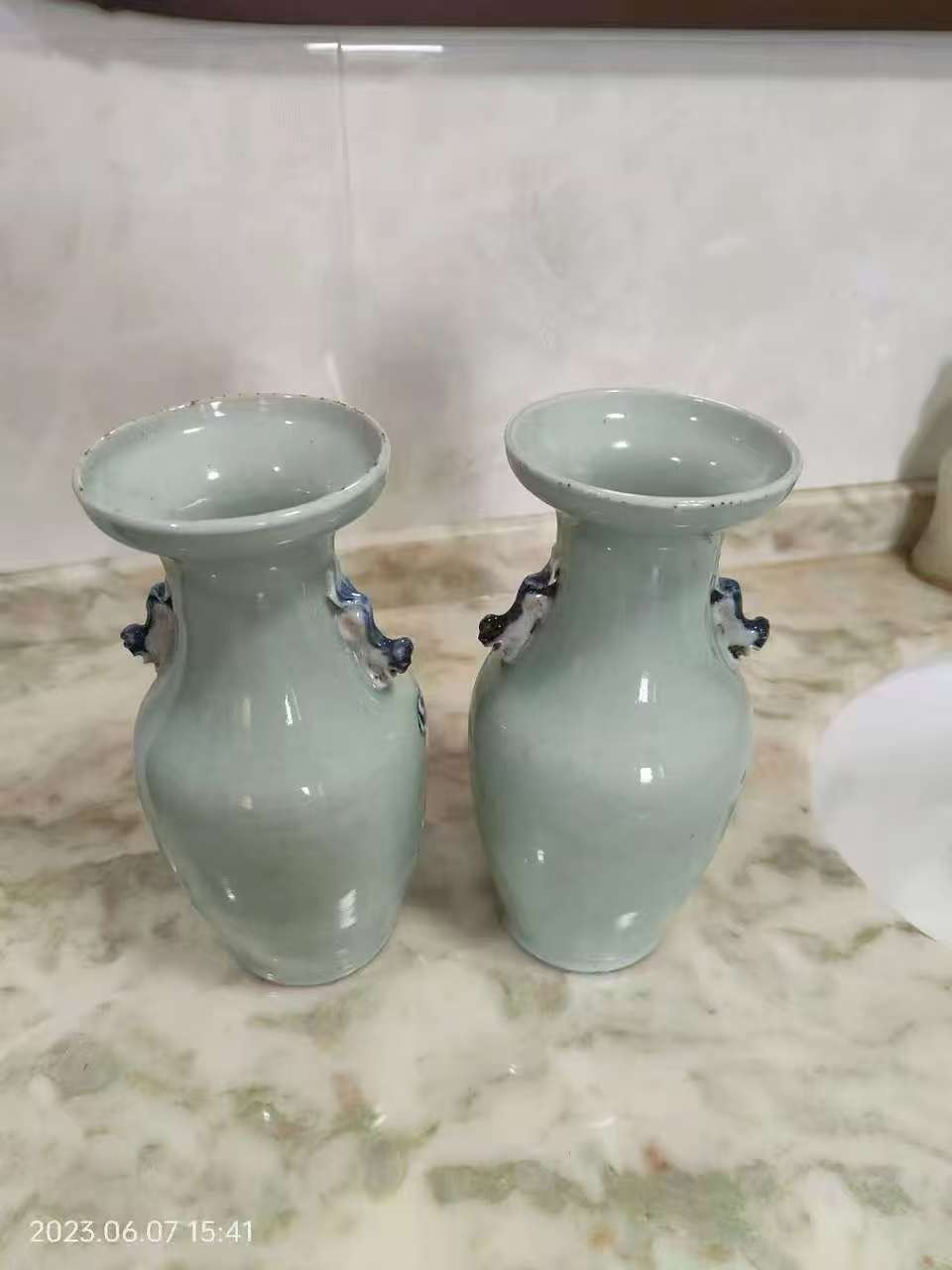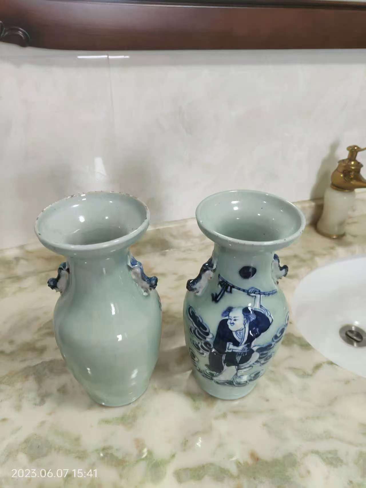 清代清花瓷瓶一对,豆青釉,青花人物双耳瓷对