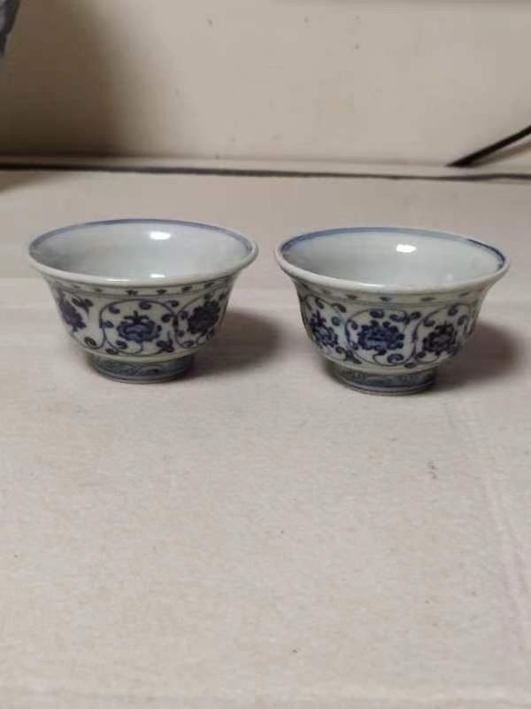 永乐青花内绘狮子纹压手杯一对