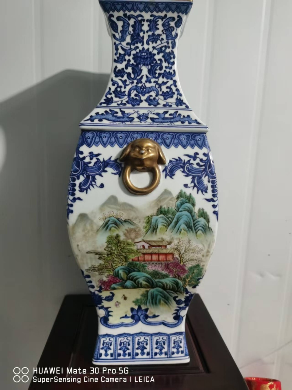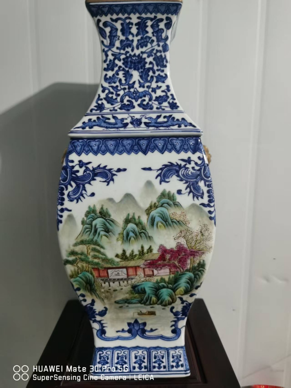 清乾隆青花洋彩开窗山水楼阁纹四方瓶