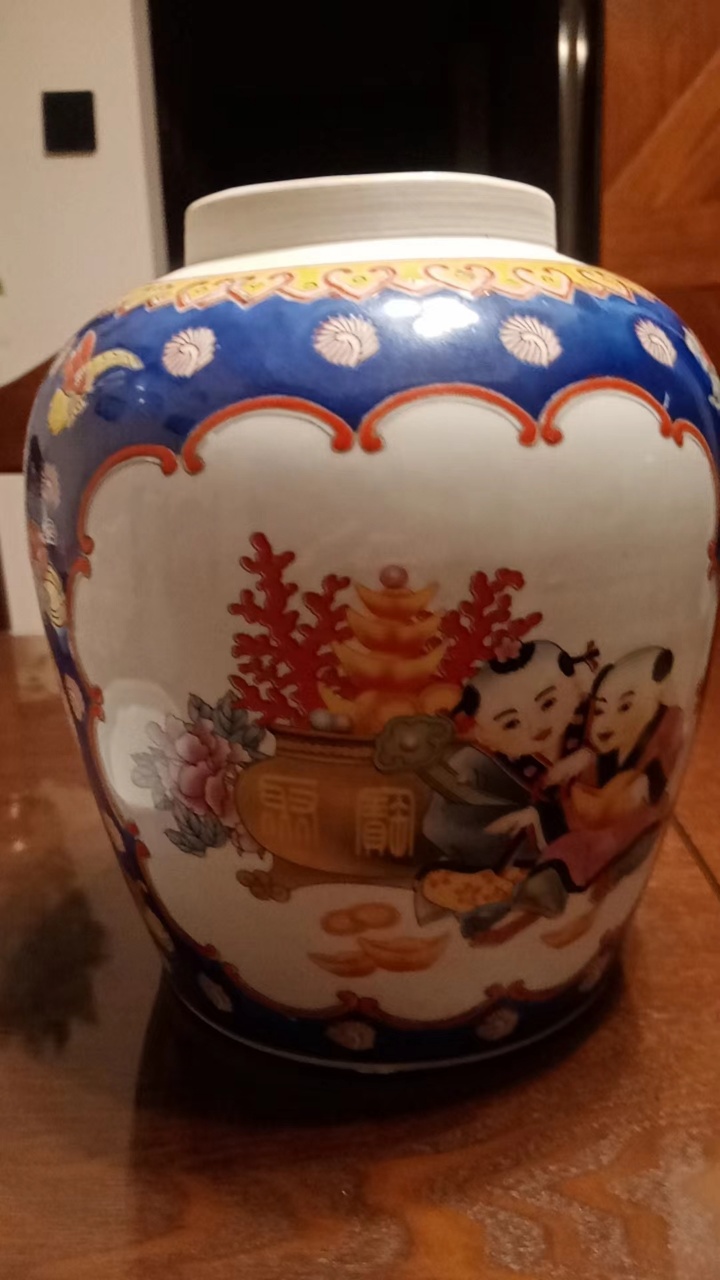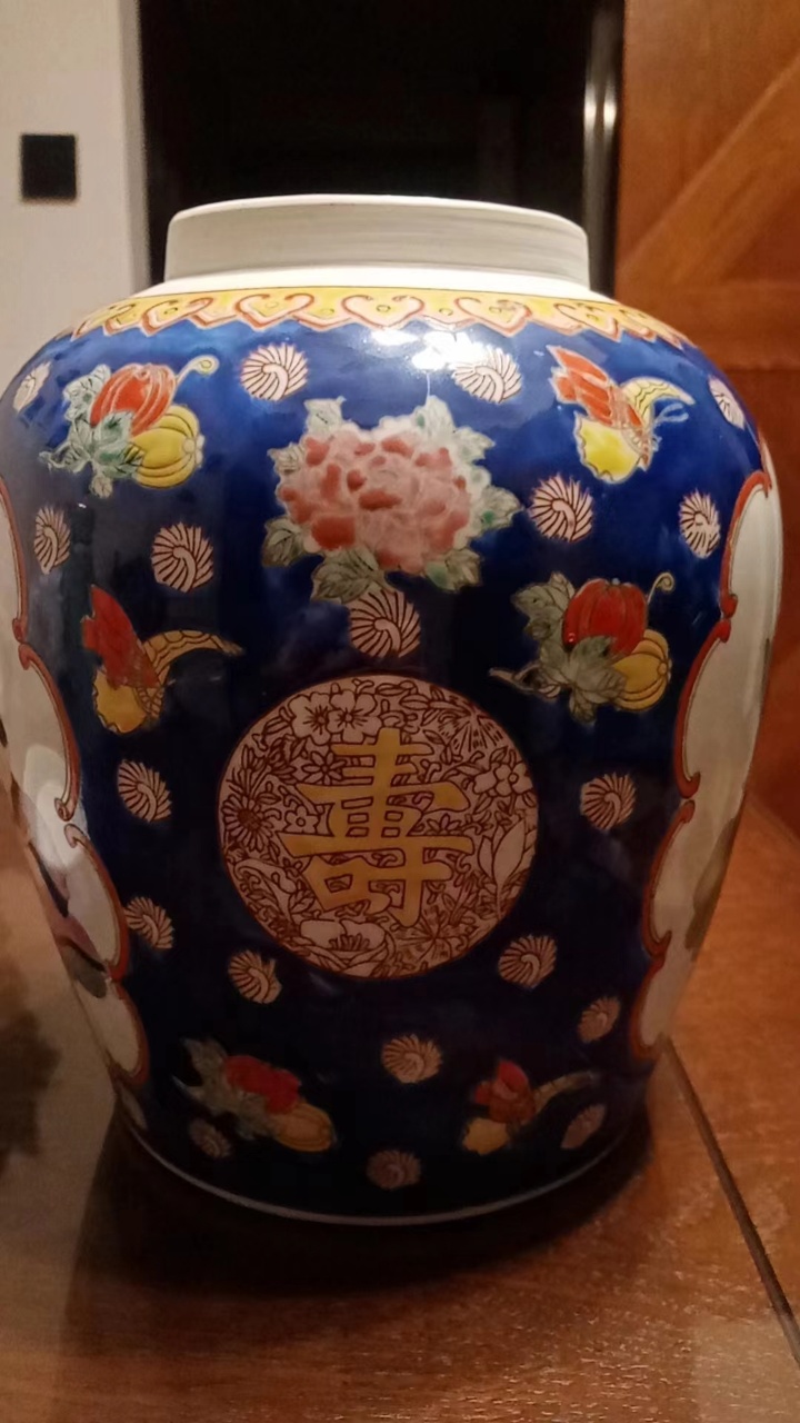 蓝地粉彩婴戏纹盖罐