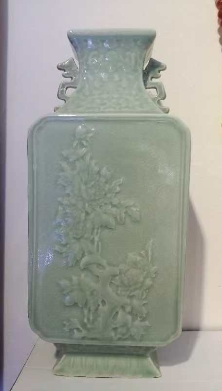 清乾隆豆青釉锦地浮雕朵花纹螭龙耳扁瓶