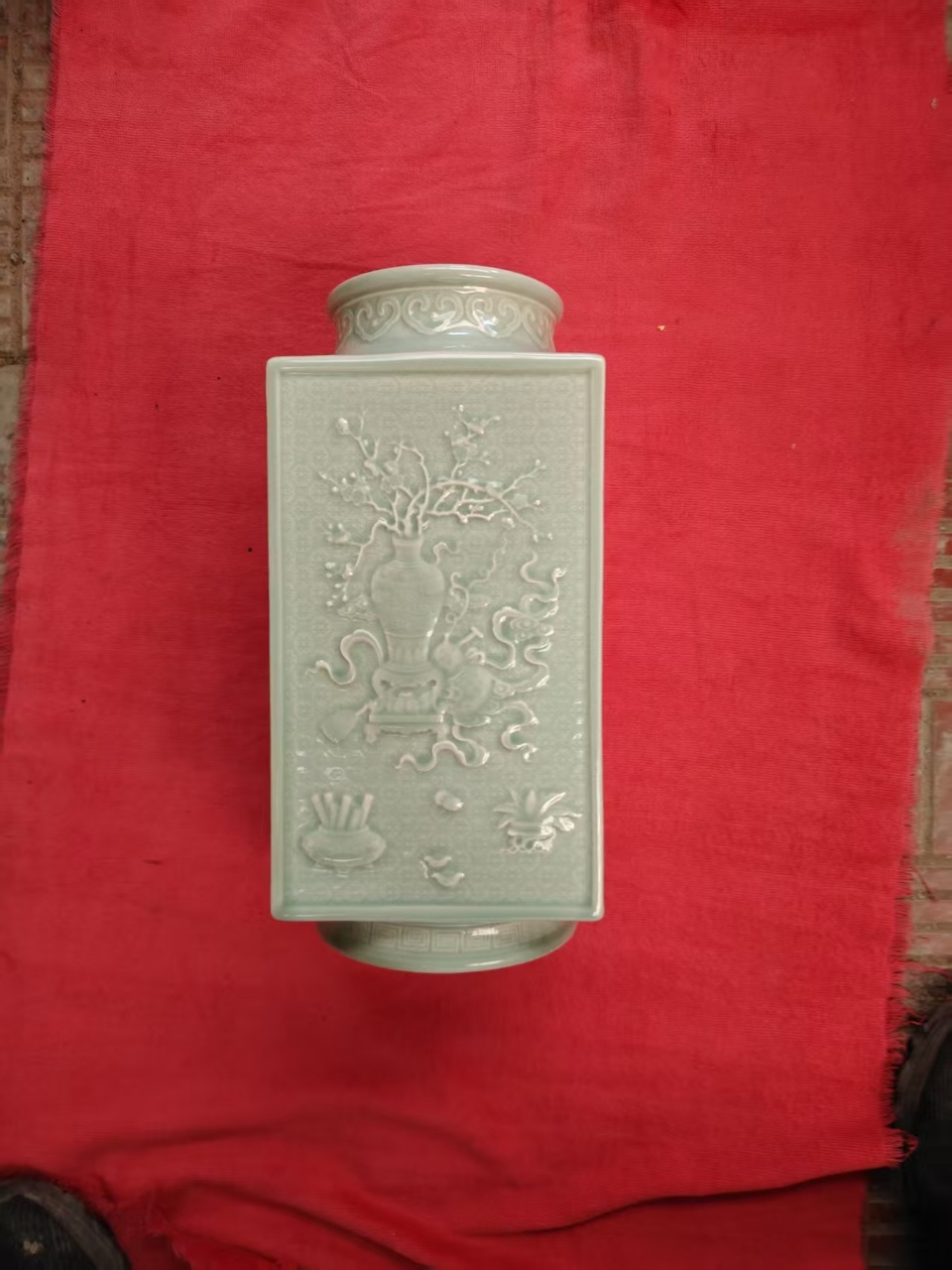 大清乾隆年制,粉青釉精刻博古纹琮式瓶
