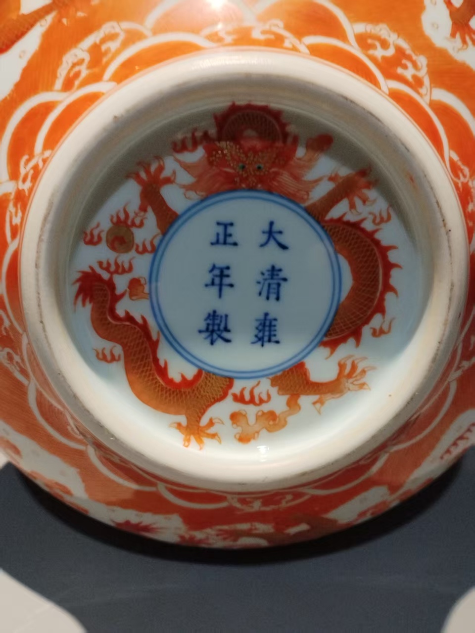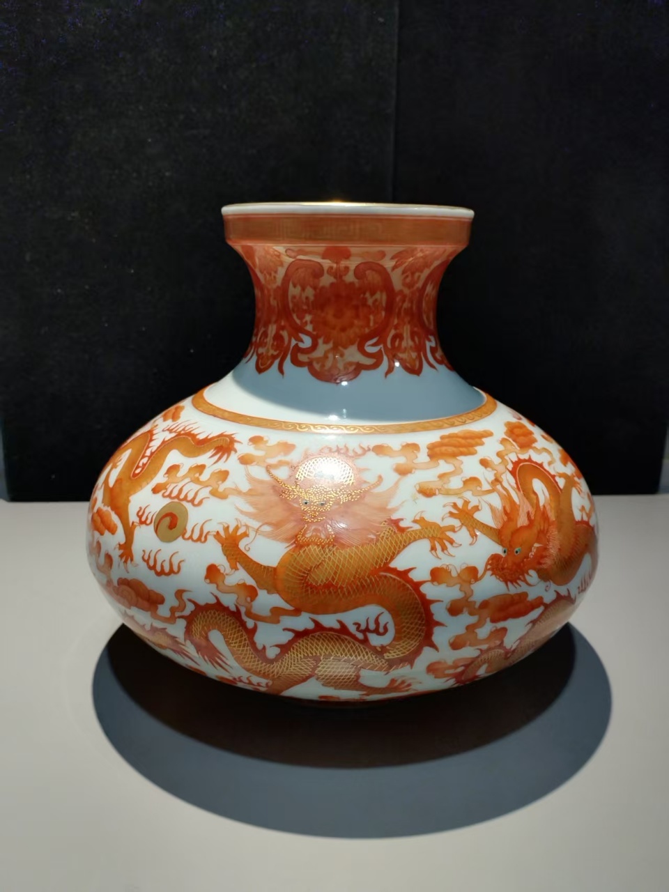 清雍正款矾红描金海水龙纹扁瓶