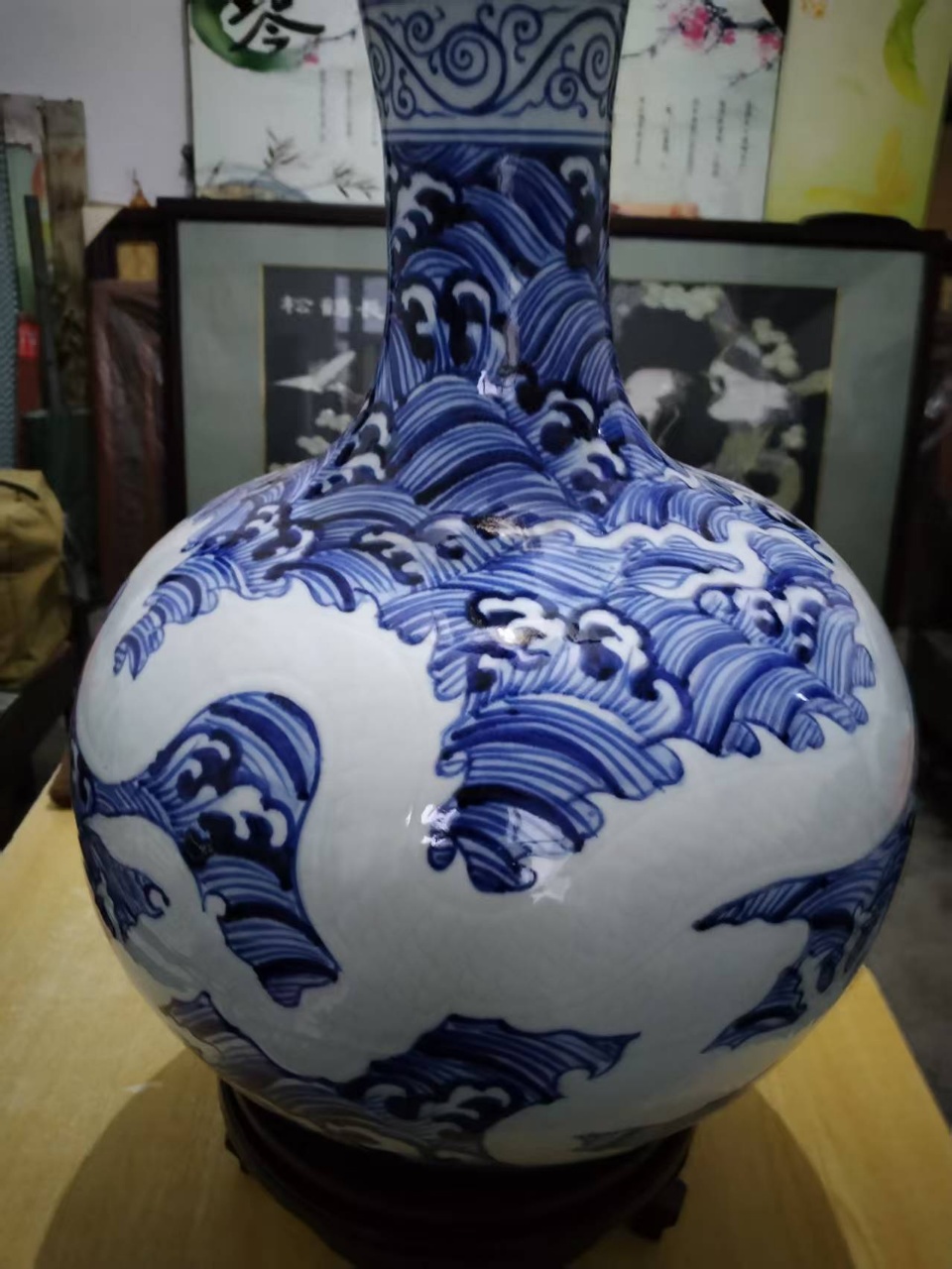 大明永乐年制,青花海水留白五爪龙厚胎天球瓶