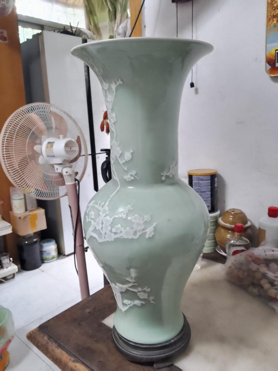 大清康熙年製青釉白梅花鸟纹花觚