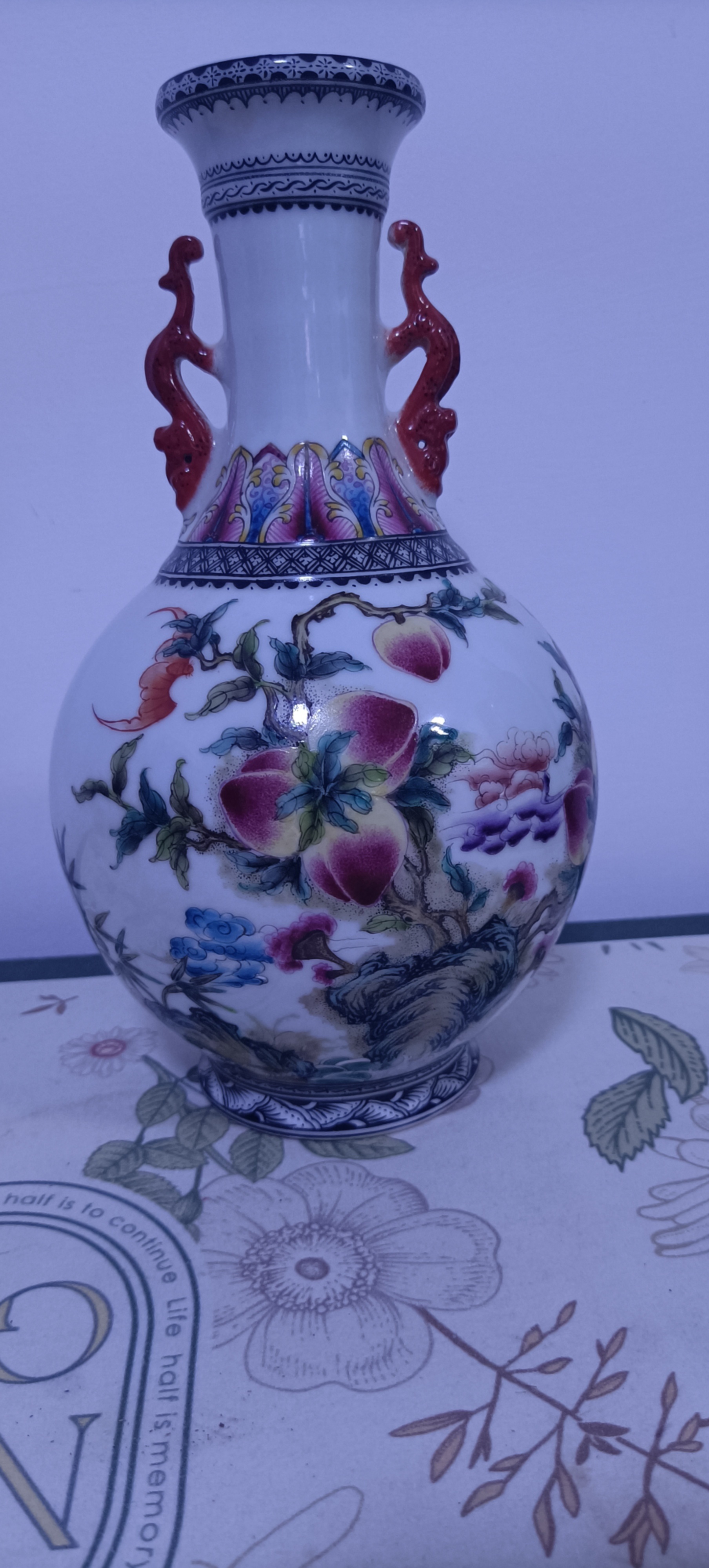 粉彩描金寿桃纹龙耳瓶