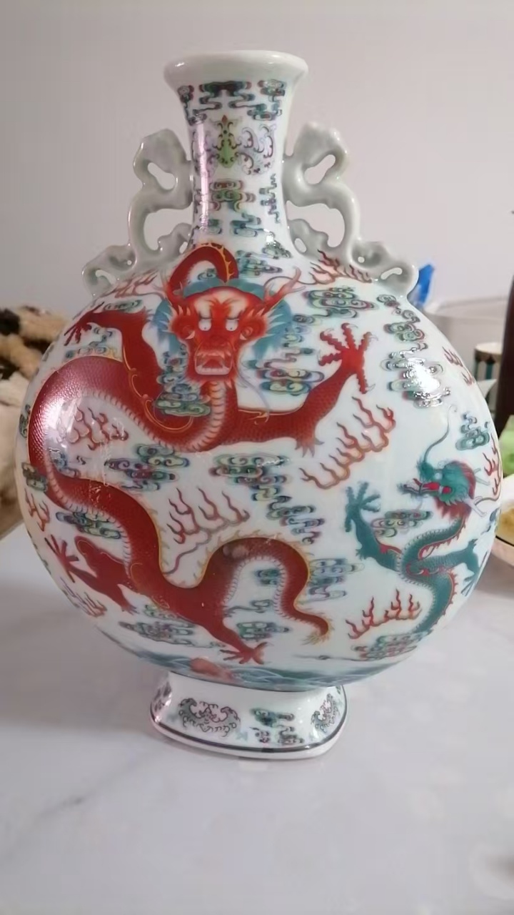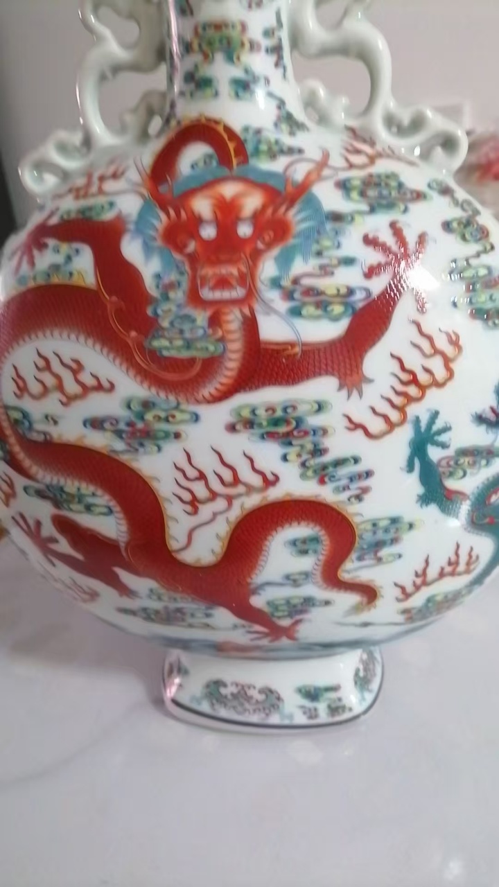 五彩苍龙教子纹双耳抱月瓶