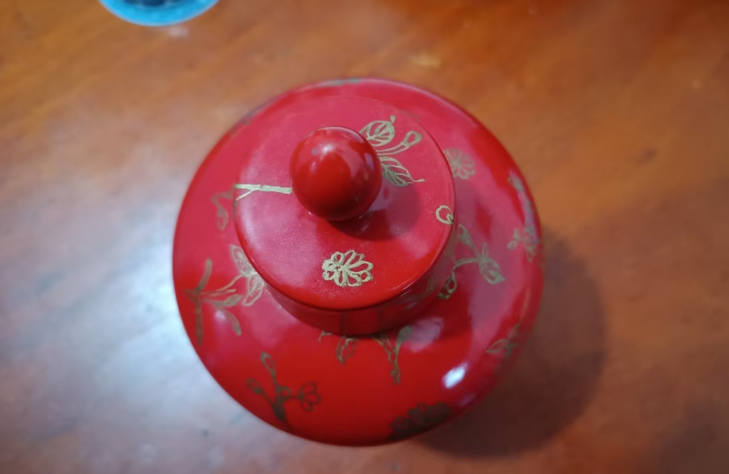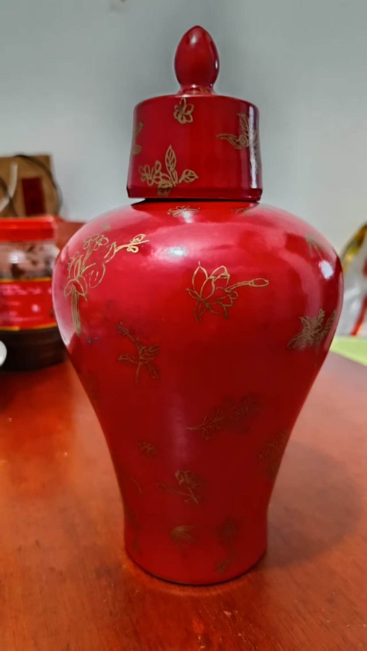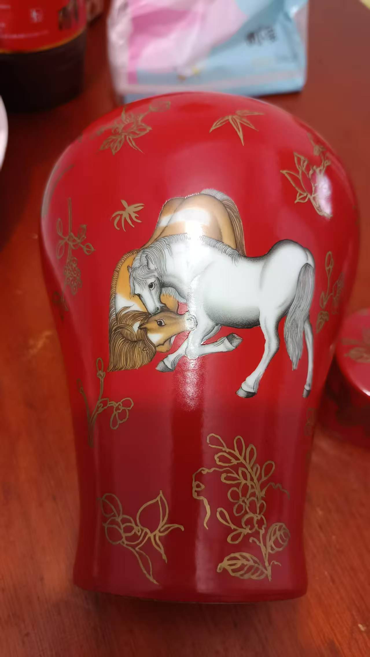 乾隆款郎窑红双马描金缠技纹带盖梅瓶